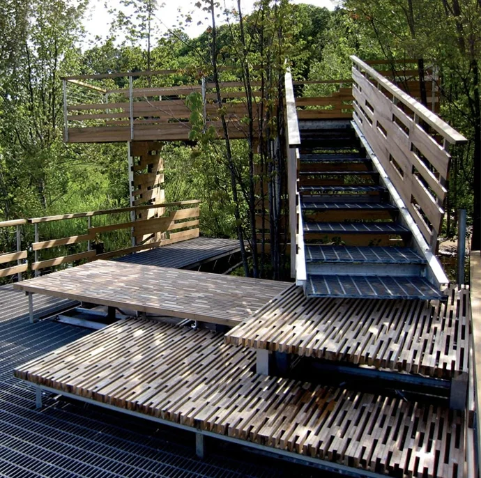 SplitFrame is the result of a collaborative design/build project at Wesleyan University. The structure enables access to a bog owned by the Audubon Society. It is situated at the end of long weir, a vestige of the wildlife sanctuary’s former use as a commercial cranberry bog. The project was designed to minimize its impact on the site, both in construction and over the projected life of the structure.